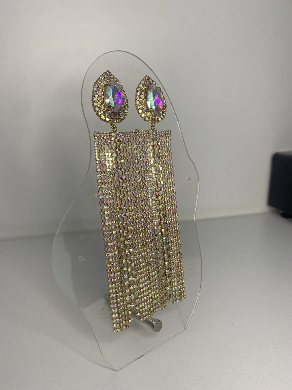 Modelo de Arete con pedrería en tornasol, arete largo ideal para un look de noche.